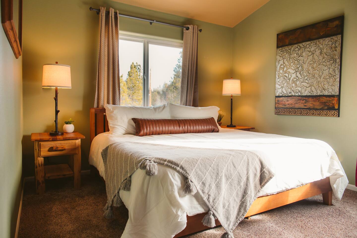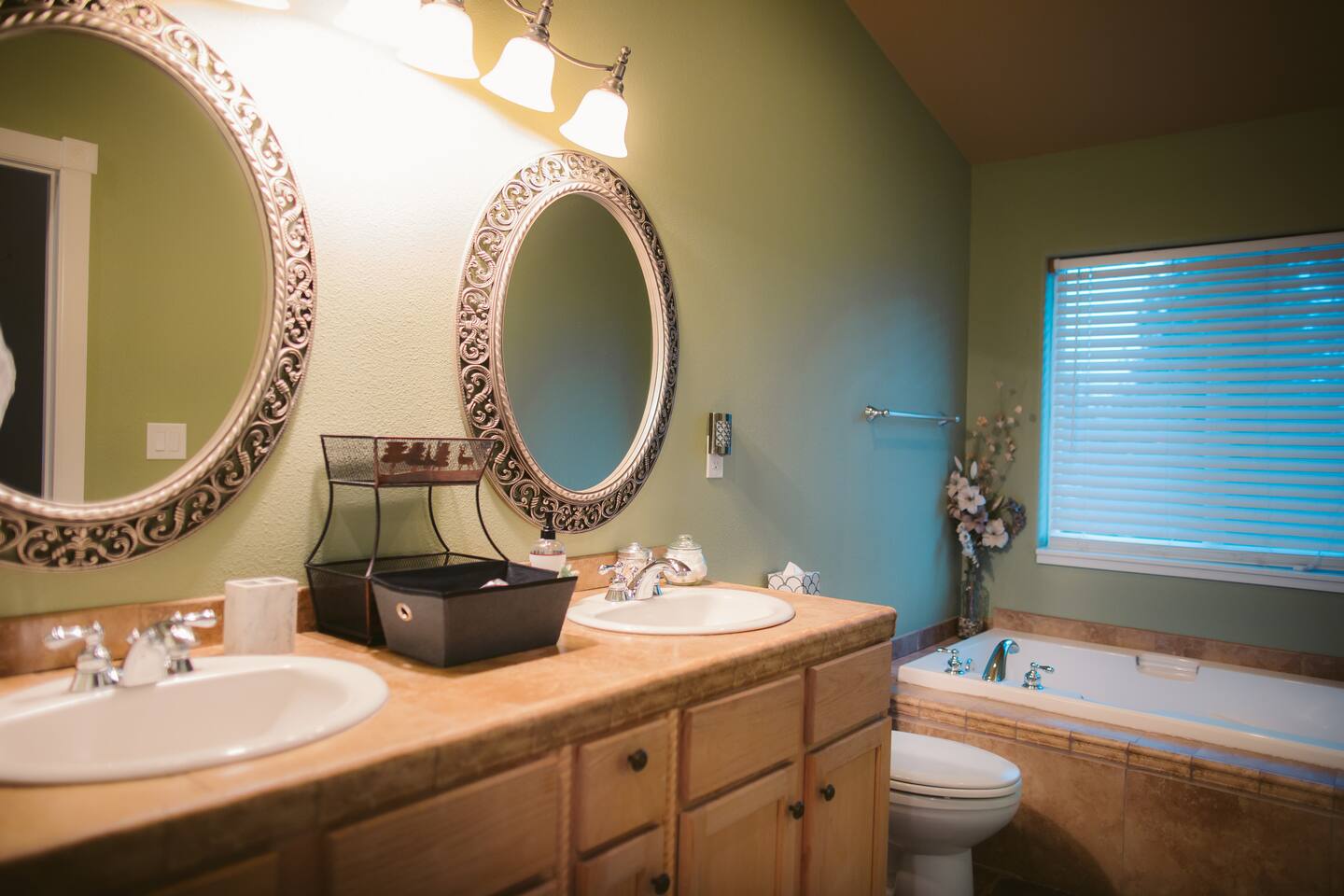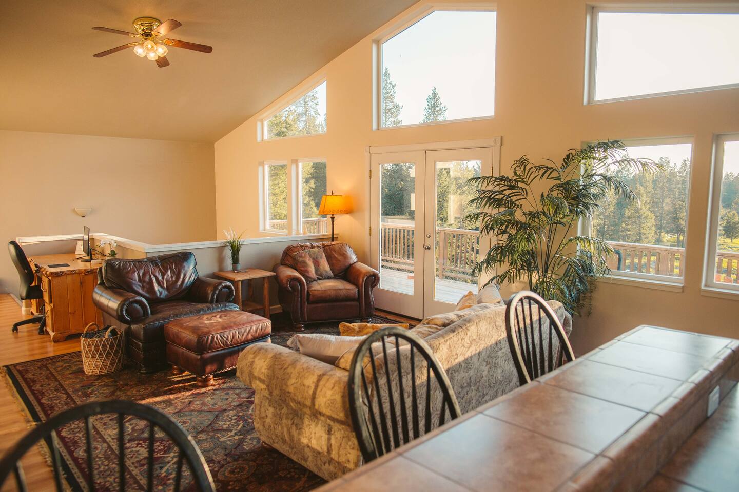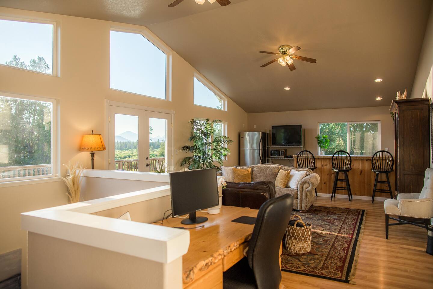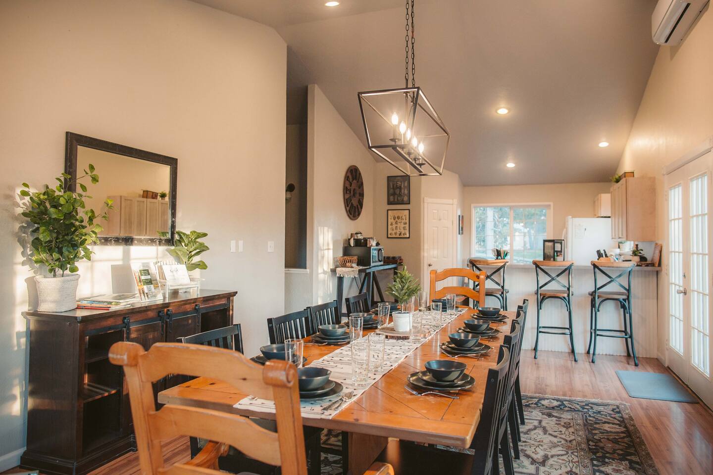 The Lazy River Lodge is within minutes to the Sunriver Resort, but lacks the crowds and nosy neighbors, making it the ultimate Central Oregon vacation spot! Your private 5,000 square foot Lodge features 5 bedrooms with 8 beds and 4.5 bathrooms - perfect for up to 14 guests and with 24-hour check-in. This home makes for the perfect corporate retreat in a quiet neighborhood surrounded by stunning mountain views and river frontage. Here is a breakdown of the rooms so you know exactly what to expect! Bedrooms: Each bedroom has high-quality memory foam beds so you can sleep like royalty and plenty of storage space for your belongings so you can unpack and feel at home. The Primary bedroom in this home is huge with a king-sized bed, ensuite bathroom even a jacuzzi spa tub! So let your body relax with a bath bomb and a good book, letting the massaging jets work their magic. Bedroom two has a queen bed, en suite bathroom and ample space! Bedroom three has a queen-sized bed and a twin bunk bed. Bedrooms four and five each have a queen bed Bathrooms: With four and a half bathrooms in the house, you’ll never have to worry about a long wait for the shower. Each bathroom is stocked with toiletries like shampoo, conditioner, body wash for your convenience and a “forgot it” kit just in case it slipped your mind to bring that toothbrush. There are both walk-in showers and tub/shower combos so if any kiddos need a bath after a fun day of exploring or swimming in the pool, you’ll have the ability to get them squeaky clean! Kitchen: The kitchen is fully equipped for any meals you choose to stay in for. Take advantage of the fridge and freezer, stove and oven, microwave, toaster, Keurig coffee machine, pots and pans, full dining sets, and dishwasher for easy cleanup. The dining room table has enough seats for up to ten guests with additional barstools at the kitchen’s island for three more. Need more cooking space? We even have a smaller kitchen area in the upstairs living room above the garage. With an additional refrigerator and freezer, another microwave, and plenty of room, you will be able to cook or prep and have the extra space you need! Living room and bonus room: There are two living rooms, one upstairs and one in the basement. The upstairs living room above the garage has a beautiful view of the mountains through large windows and glass French doors leading out to the private deck. There are two comfortable sofa chairs and a larger couch. This living area also has a private desk for anyone that needs to get some work done while they’re away. High-speed wifi is connected throughout the home so you won’t have to worry about lags or dropouts. The downstairs area is a large family room/game room with a couch that can fit the whole family and a queen size murphy bed. Spend the evenings playing on the shuffleboard, have some friendly competition, or sit around with some drinks and enjoy the night. There is plenty of room for the kids to have their own area to play, while the adults enjoy each other's company. Our home theater is always a guest favorite! There is a large projector screen on one wall with two rearrangeable sofas facing it. Keep them set up as a couch, or add in the middle sections to make a comfortable bed to watch your favorite movies on. The theater is equipped with surround sound to give you the best viewing experience. The indoor pool is another guest favorite! And how could it not be?? The pool is heated to about 85 degrees and has plenty of fun pool toys including pool noodles and floats for the little ones that might need some help in the water. Please note that you will be swimming at your own risk and there should be an adult present any time children are in the pool area. Tired from a long day exploring in the mountains? We also have a hot tub for you to enjoy during your visit! Outside: The home sits on 2.7 private riverfront acres as your backyard and all to yourselves. The Lazy River Lodge is perfect for families or groups due to it's living space separation. With the main home on one side of the pool room and apartment on the other, each group can have their own space while still being together. Take a lovely stroll down the hill, where you’ll find our gazebo picnic area and a dock directly on the Little Deschutes River! Bring your own floatation devices or paddle-boards for a pleasant 1.5 - 2 hour float carrying you to the La Pine State Park (just a 13 min pick up drive from the home) On the 2.7 acres, you have access to the home, free private parking, a fire pit, dock and gazebo on the river. It’s easy to spend all afternoon and evening enjoying the space and all it has to offer. Relax with your favorite book under the gazebo, sip your morning coffee on the deck, sit and watch all the wildlife from almost anywhere on the property. Take a stroll along the river, have a campfire in the evening and roast some marshmallows while you reminisce Front Entrance: You'll find the front door along the left side of the home. There is a well-lit path to the entrance that lights up with a motion light as you walk towards the door. Access is with a keyless entry pad that offers a personalized code for each guest so you can feel safe knowing that any previous guest codes have been deleted.